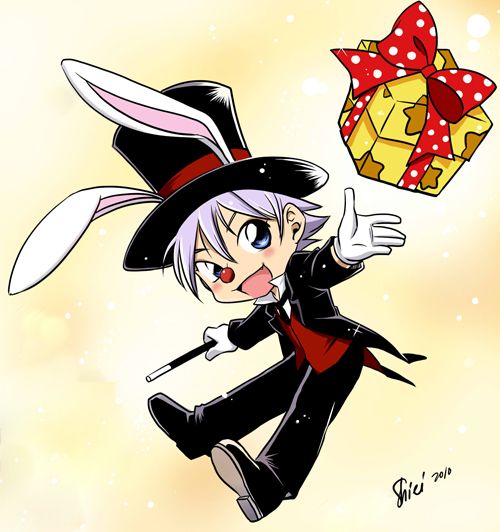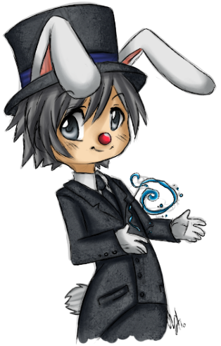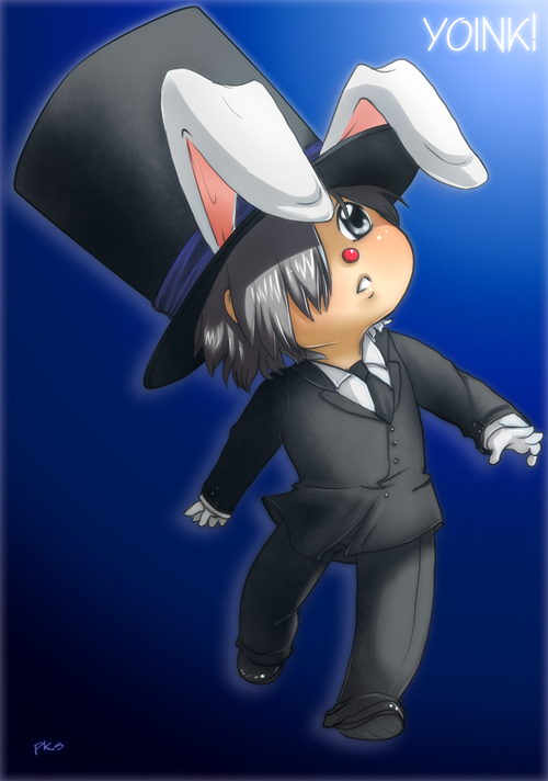 Yoink is a spirit representation of entertainment, theatrics, and illusion; his appearance is a fusion of the magician, the dissappearing rabbit and the clown. Punished and exiled, he is now looking to escape his punishment. Unfortunately, magic has almost dissappeared completely from the world, but he'll show magic to mortals again. He doesnt think that it's right to have magic gone from the world especially when he has so much fun with it. He believes people work too hard and they lost sight of things that could make them happy and imagine things.